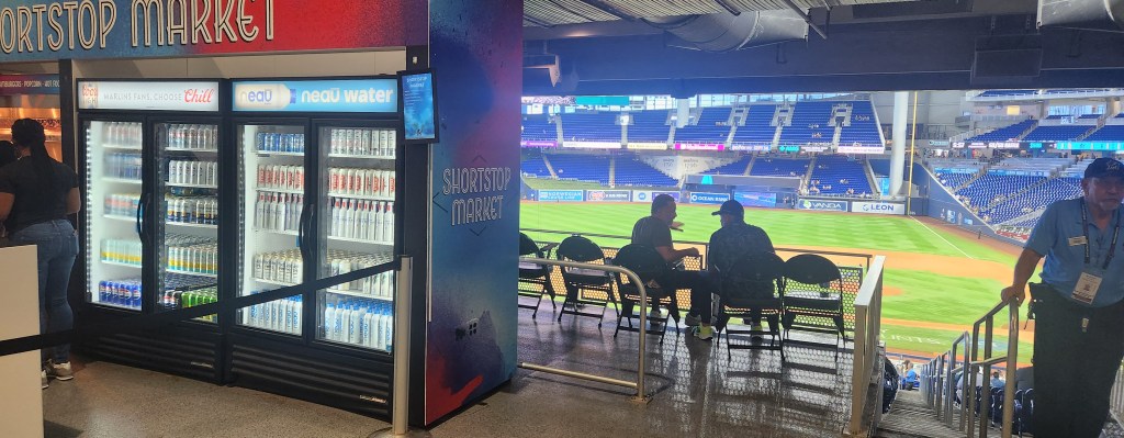 Right when you get to the outfield coming from the left field foul pole, around section 28/29, they have The Lineup Food Hall section with some different food stands and there’s a patio area you can walk out to and get a great view of the downtown Miami skyline which I really like.